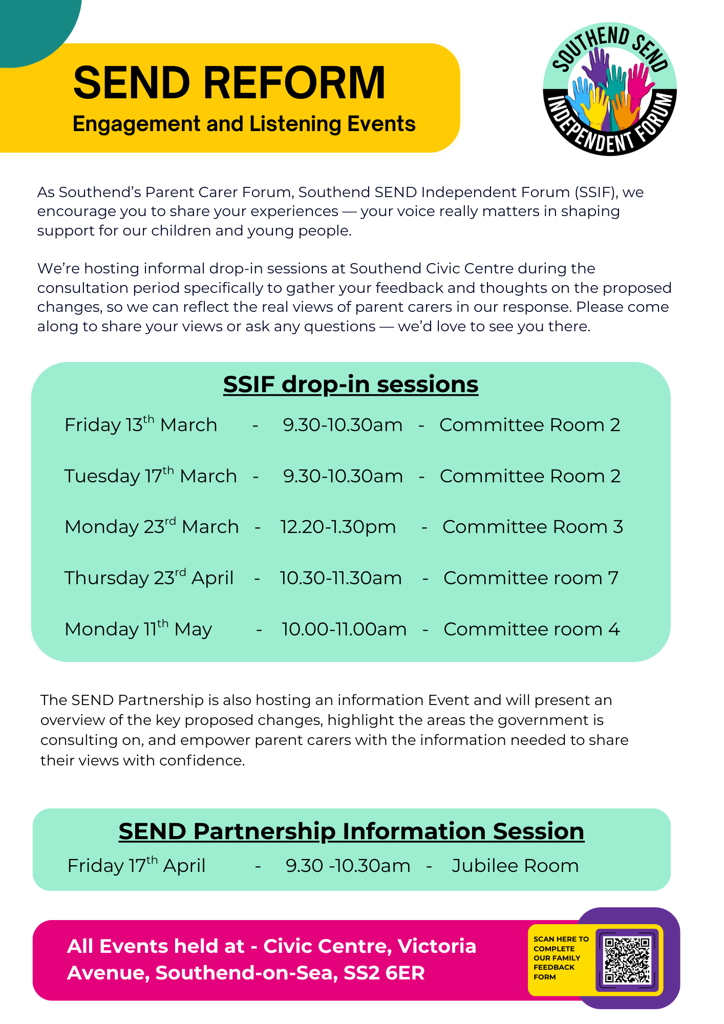 The Southend SEND Area Partnership have issued a letter about the proposed Government SEND reforms and the consultation. You can read the letter in full here: 25 February 2026 Dear parent carers, The Government's Schools White Paper, Every child achieving and thriving was published this week (Monday 23 February 2026). This White Paper sets out proposed reforms to the schools and Special Educational Needs and Disabilities (SEND) system in England. We expect more detail to become available over the coming weeks and will share further information with you as soon as we can. We understand that these announcements may create uncertainty for families of children and young people with SEND. We want to reassure you that nothing about the support you currently receive will change at this stage. These proposals are part of a national consultation, and no decisions have yet been finalised. Leaders from Southend-on-Sea City Council and the Integrated Care Board will now take time to carefully review the proposals so we can understand what they may mean for our local area. We are encouraged that the reforms aim to improve help and support for children and young people with SEND, with a commitment to ensuring the right resources are in place to deliver this. The improvement work the SEND Area Partnership has undertaken over the last three years places us in a good position to align with the principles set out in the reforms – early and fair support, delivered through collaborative working and shared accountability. The Government's consultation on the proposed reforms is now open and seeks feedback from everyone with an interest in SEND, including parents, carers, young people, and professionals. You can read the proposals and share your views here: SEND reform: putting children and young people first - Department for Education - Citizen Space The Partnership fully agrees that the voice of families must remain central as we consider these proposals and prepare our response to the consultation. As Southend's Parent Carer Forum, Southend SEND Independent Forum (SSIF) encourages parents and carers to engage with the consultation to share your lived experiences as these are vital in shaping a system that truly reflects the needs of our children and young people. Throughout the consultation, SSIF are hosting informal in-person drop‑in sessions at Southend Civic Centre where you can share your views and ask questions. Drop-in session dates: Friday 13 March, 9.30am to 10.30am Committee Room 2 Tuesday 17 March, 9.30am to 10.30am Committee Room 2 Monday 23 March, 12.30pm to 1.30pm Committee Room 3 Thursday 23 April, 10.30am to 11.30am Committee Room 7 Friday 1 May, 12.30pm to 1.30pm, Committee Room 7 Monday 11 May, 10am to 11am, Committee Room 4 The Partnership will also host an in-person information session on Friday 17 April 2026 at Southend Civic Centre (Jubilee Room) from 9.30am to 10.30am. Find out more and book your place through Eventbrite: SEND Reform Family Engagement session A further online session will be confirmed shortly. We encourage you to follow SSIF and the SEND Local Offer social media channels for updates: www.facebook.com/TheSSIF/ www.instagram.com/southendsendindependent www.facebook.com/SouthendCouncilSEND/ www.instagram.com/southendcouncilsend/ It is important to note that the new system is not expected to be enacted until 2029. In the meantime, the Southend Area Partnership focus will remain on continuing the improvements achieved so far and ensuring children and young people in Southend receive the support they need. Signatories: Michael Marks, Executive Director, Children and Public Health, Southend-on-Sea City Council Dr Giles Thorpe, Executive Chief Nursing Officer, Mid and South Essex ICB Philomena Johnson, Strategic Lead for Education and Social Care, Southend SEND Independent Forum Samantha Delve, Strategic Lead for Health, Southend SEND Independent Forum