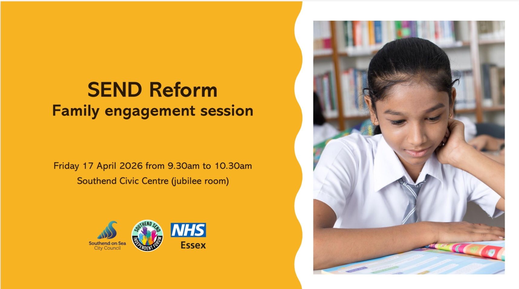 Event details SEND Information Day Southend SEND Independent Forum (SSIF) and the SEND Local Offer Team are pleased to announce the second Southend SEND Information Day on Tuesday 16 June 2026. This is a free event for the Southend SEND community. It is open to parent carers or family members of children or young people with SEND, and professionals. Venue: Southend Civic Centre, Victoria Avenue, Southend-on-Sea, SS2 6ER Time: 9.30am to 2.30pm Hold the date - further information to follow soon! For a taste of what to expect at the event in June, read about the 2025 SEND Information Day and watch videos here . Pre-register for the event! You can just drop-in on the day, but why not make things easier and pre-register?! Get advance information about the event direct to your inbox, so you can plan your visit and make the most of your time.
